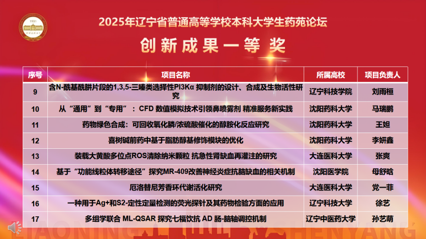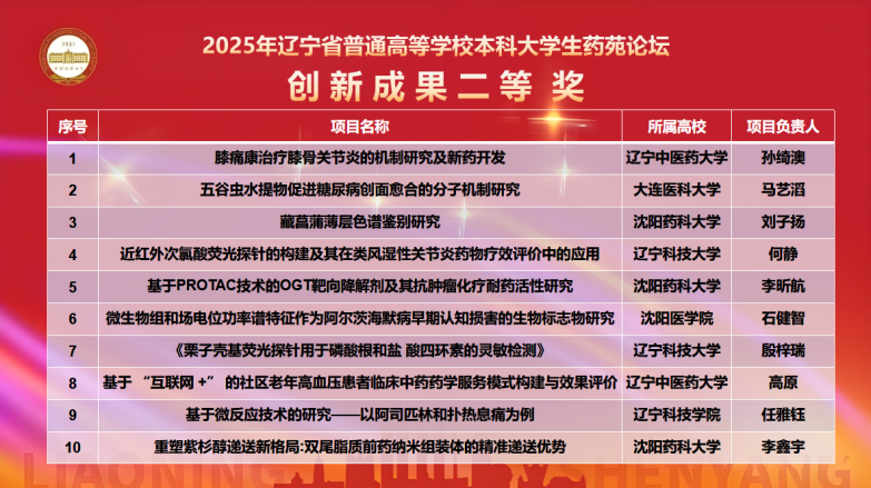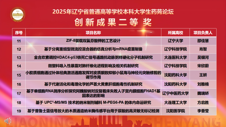 11月7日,由辽宁省教育厅主办、Beat365中文官方网站承办的“2025年辽宁省普通高等学校本科大学生药苑论坛”在南校区图书馆国为报告厅举行。本次论坛吸引了来自大连理工大学、辽宁大学、大连医科大学等15所兄弟院校的500余名师生参赛,充分彰显了辽宁药学教育领域的蓬勃活力与深厚底蕴。山东大学、大连理工大学、辽宁大学、大连医科大学、Beat365中文官方网站、辽宁中医药大学、沈阳医学院的专家出席论坛并对参赛项目进行现场评审。