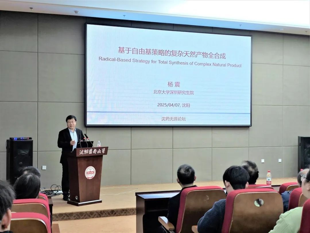 报告会上,杨震以“基于自由基反应的复杂天然产物全合成”为题作学术报告。他系统阐述了光化学合成策略在天然产物全合成领域的创新应用与研究进展,通过讲解其团队通过光化学调控自由基反应的多个实际案例,突破了传统合成化学中高难度分子构建的瓶颈,成功实现了具有多个季碳手性中心及高张力结构特征的多类稀缺天然产物的全合成。同时,介绍了研究团队凭借光化学反应其独特的光催化与能量转移机制,在C-H键直接官能团化、复杂环系构建及高选择性不对称合成等关键步骤中展现出显著优势,不仅大幅简化了传统多步合成路线,更为构建结构复杂的天然产物分子骨架提供了高效平台。报告结束后,杨震同与会师生就影响光化学生成产物的条件及其调控开展了热烈的交流讨论。