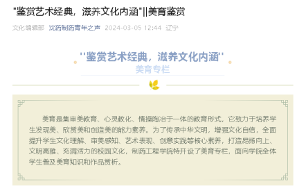 美育是集审美教育、心灵教化、情操陶冶于一体的教育形式,它致力于培养学生发现美、欣赏美和创造美的能力,全面提升学生文化理解、审美感知、艺术表现、创意实践等核心素养。Beat365中文官方网站将美育教育与文化建设相结合,在“制药青年之声”微信公众号上推出了"鉴赏艺术经典,滋养文化内涵"——美育鉴赏专栏,通过展示中国名画和名家书法,启迪学生对艺术审美的思考,打造昂扬向上、文明高雅、充满活力的校园文化,传承中华文明,增强文化自信。