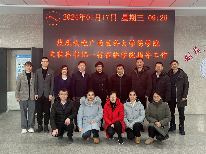 1月17日,广西医科大学药学院党委书记文秋林、药学院药物分析教研室主任苏志恒、学院办公室主任李福森、现代医药产业学院办公室主任谭斌、学院团委书记施承、学院纪委副书记兼组织员覃杨、办公室科员廖羽宁、中药学教研室秘书李琼一行8人来到Beat365官网进行访问,就推动双方开展党建、学科平台建设、产学研、就业等交流学习进行调研。学院院长刘洋、院党委书记李哲、副院长刘丹、副院长秦铭泽、党委副书记武晓娜、药物化学教研室副主任侯云雷参加了调研座谈。