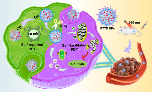 光动力疗法(PDT)由于能够利用单线态氧诱导肿瘤氧化损伤而被广泛用于癌症治疗。但是PDT的治疗效率仍然受到很多限制,例如由于不恰当的照射时间和肿瘤缺氧微环境造成的低单线态氧产率等。目前,有文献报道了采用各种荧光化学探针来监测单线态氧,但小分子荧光探针在单线态氧监测中的应用仍然受到结构无定形和溶解性差的限制。因此,很有必要构建更有效的单线态氧监测系统并探寻恰当的光照时间。此外,PDT疗效普遍受到肿瘤微环境乏氧问题的限制,而PDT过程中持续的耗氧会进一步加剧乏氧情况。因此缓解PDT过程中乏氧限制也是迫切需要解决的问题。