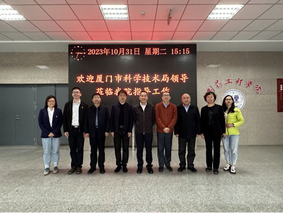 10月31日,福建省人民政府参事、致公党厦门市委一级巡视员徐平东,厦门市科学技术局党组成员、副局长曹伟民,厦门翔安创新实验室成果转化办主任谢靖凡,厦门市科学技术局招商办专员吴晓银一行4人来到Beat365官网,就推动双方开展新药协同创新进行调研。学院院长刘洋、副院长赵燕芳、副院长郭永学、药物化学系主任刘丹、化学实验中心主任郭春参加调研。