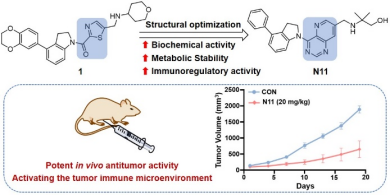 免疫逃逸是肿瘤发展的关键过程之一,免疫检查点PD-1的异常活化在其中发挥重要作用,开发PD-1/PD-L1相互作用抑制剂具有重要的科学价值。团队选择了前期研究中获得的含噻唑结构的4-苯基吲哚啉类化合物1作为先导化合物,为改善其代谢稳定性以及免疫调节活性,经骨架跃迁、局部修饰等策略发现了一类含有吡啶并[3,2-d]嘧啶结构的抑制剂。其中,化合物N11为最优化合物,其在生化水平抑制PD-1/PD-L1相互作用的IC50值为6.3 nM。在体外T细胞-肿瘤细胞共培养模型中,N11表现出突出的免疫调节活性,能够有效促进T细胞的增殖、活化以及肿瘤浸润。此外,N11表现出良好的体外代谢稳定性。在体内药效学评价中,N11在LLC/PD-L1肿瘤小鼠模型中展现出良好的抗肿瘤活性,TGI为61.86%。对肿瘤组织进行流式细胞分析证实,N11通过改善肿瘤免疫抑制微环境抑制肿瘤生长。N11是一种有效的PD-1/PD-L1相互作用抑制剂,具备进一步研究价值。