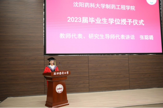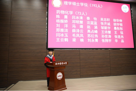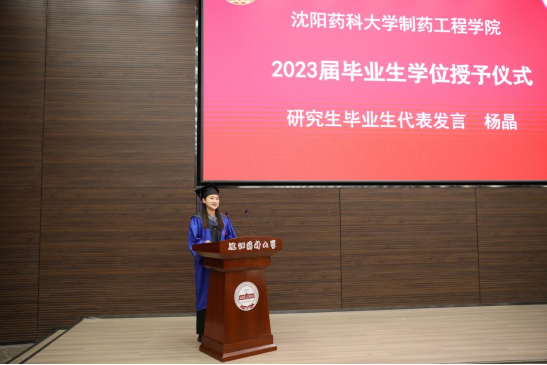 86期制药工程专业毕业生吴帛洋、2020级药物化学专业毕业生杨晶同学分别代表毕业本科生和研究生发言。两位同学深情表达了对母校的感谢之意、对师长的感恩之心、对同学的不舍之情,呼吁同学们发挥青年人的朝气和锐气,踔厉奋发,笃行不怠,不负青春,不负韶华,肩负起兴药报国的使命,力争做出更多更好的成绩以回报母校的培养,把追梦的青春播撒在中华民族伟大复兴的事业里,让多彩的理想盛放在不忘初心砥砺前行的奋斗中。