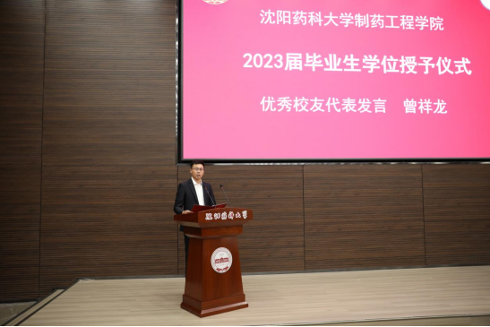 74期制药工程专业、2014级药物化学硕士、百济神州(上海)生物医药技术有限公司地区经理曾祥龙作为校友代表发言。他回顾了在沈药度过的美好求学时光,分享了求学过程中的学思践悟,建议即将步入社会的师弟师妹们加强学习能力、自我管理能力、心态调整能力的培养,用所学的专业知识及踏实的从业态度渡过迈入社会的过渡期。