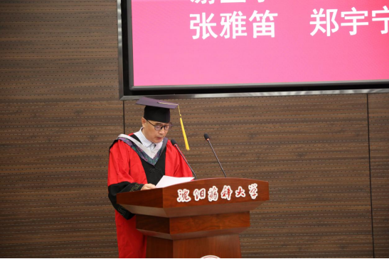 学院院长、院学位评定分委员会主任委员赵临襄宣读2023届博士学位授予名单;药物化学学科副主席许佑君、制药工程学科副主席刘洋、化学学科主席胡春、化学工程与技术学科主席侯晓虹分别宣读各学科2023届硕士学位授予名单;制药工程专业负责人刘丹、药物化学专业负责人郭春、环境科学专业负责人张聪璐、应用化学专业负责人胡春分别宣读2023届学士学位授予名单。