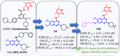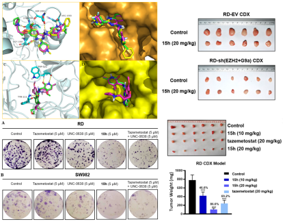 本课题组以Tazemetostat和BIX-01294为先导化合物,运用拼合原理并结合计算机辅助药物设计,设计并合成了一系列G9a/EZH2双靶点抑制剂。其中化合物15h对RD细胞和SW982细胞抗增殖活性最强(RD: IC50= 19.63 ± 0.18 μM; SW982: IC50= 19.91 ± 0.50 μM),优于先导化合物。体外酶活性评价显示化合物15h在体外对EZH2(IC50= 4.35 ± 0.02 nM)和G9a(IC50= 2.90 ± 0.05 nM)保持良好的抑制活性。横纹肌肉瘤RD细胞异种移植小鼠模型评估结果显示,化合物15h(20 mg/kg, TGI: 86.6%)的肿瘤抑制效果显著优于单一EZH2抑制剂Tazemetestat (20 mg/kg, TGI: 69.2%)。一系列靶点特异性检测实验和选择性实验结果表明,化合物15h通过特异性抑制EZH2和G9a而发挥抗肿瘤作用。此外,还开展了化合物15h的代谢稳定性、药代动力学特征、血浆蛋白结合率、初步安全性等评估,结果表明化合物15h具有良好的成药性。15h是治疗恶性横纹肌肉瘤和其他肿瘤的潜在候选药物。