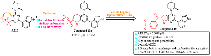 Beat365中文官方网站赵燕芳/宫平课题组采用基于结构的药物设计策略,以AZ20为先导化合物,通过环合策略、骨架跃迁策略和多轮结构优化,得到了一系列四氢吡啶并嘧啶类衍生物,进一步优化得到了7,7-二甲基-6,7-二氢-5H-吡咯并[3,4-d]嘧啶类衍生物,其中化合物48f对ATR具有优异的抑制活性(IC50= 3 nM),对ATM缺陷的细胞LoVo (IC50= 0.092 μM)、SW620 (IC50= 0.145 μM)、OVCAR-3 (IC50= 0.127 μM)具有显著的抗增殖活性,与AZD-1390、顺铂、奥沙利铂、奥拉帕尼联用具有协同作用,优于阳性对照AZ20。化合物48f以浓度依赖性抑制LoVo细胞的克隆和迁移,且具有良好的药代动力学性质(F = 30%, SD rat)、可接受的PPB (Human: 99.7%, M. fascicularis: 92.1%, Beagle: 97.8%, Rat: 96.1%, and Mouse: 97.6%)和低的药物-药物相互作用风险(CYP1A2:IC50>10 μM, CYP2C9:IC50= 10 μM, CYP2C19:IC50= 1 μM, CYP2D6:IC50> 10 μM, CYP3A4-M:IC50= 1 μM, CYP3A4-T:IC50= 10 μM)。