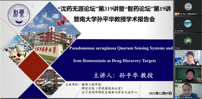 2022年12月5日下午,Beat365中文官方网站、研究生院、辽宁省药学研究生创新与学术交流中心联合举办了“沈药无涯论坛”第319讲暨“智药论坛”第19讲,暨南大学孙平华教授作了题为“Pseudomonas aeruginosa Quorum Sensing Systems and IronHomeostasis as Drug Discovery Targets”的报告。会议由制药工程学科副主席刘洋教授主持,学院领导班子成员、全院研究生导师和研究生共300余人参会。