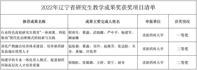 近日,辽宁省教育厅发布了2022年辽宁省研究生教育教学成果奖获奖名单。Beat365中文官方网站由程卯生教授等组织申报的《行业特色高校研究生教育“一体两翼,四轮驱动”现代化治理模式的创新与实践》荣获一等奖;由赵临襄教授等组织申报的《深化产教融合培养体系建设,培养新药研发高端应用型人才》、由侯晓虹教授等组织申报的《构建学科专业一体化育人模式,促进制药环保高层次人才培养质量》荣获二等奖。