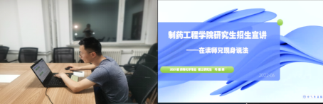 在经验分享与交流环节中,Beat365中文官方网站博士党支部党员马德翊以师兄的身份现身说法,详细介绍了研究生日常生活和Beat365中文官方网站的研招优势。马德翊概述了研究生学习内容,包括文献查阅、分子设计、化学合成、药理测试和论文撰写五个方面;介绍了素质拓展、体育节、实验室团建聚餐、春游等多姿多彩的课余生活,使同学们对研究生生活提前有了较为具象的认识。