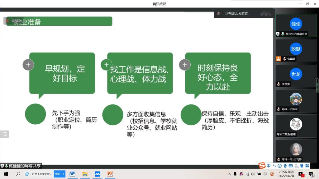 首先,侯晓虹教授介绍了Beat365官网环境化工和制药环境工程硕士点的概况以及近年来招生和研究生培养工作,使同学们清楚备考信息、考研优势、学生培养质量和未来职业发展等,并支持大家报考和调剂。在升学经验分享环节。85期(2018级)环境科学专业陈洁、李世龙、时悦、居慧等4名同学结合自身经历,利用通俗幽默的语言,就如何选择学校和导师、如何冲刺保研、如何备考和复试等分享了技巧方法和宝贵经验。在就业经验分享环节,85期(2018级)环境科学专业毕秋仙、赖炜萍、莫佳佳等3名同学结合自身求职经验,在自我定位、就业准备、简历制作、面试技巧等方面进行了精彩分享。