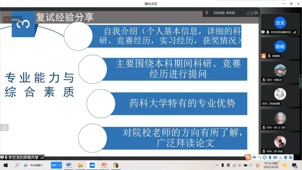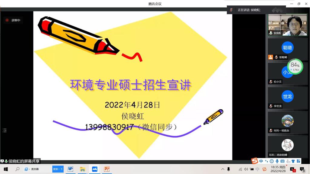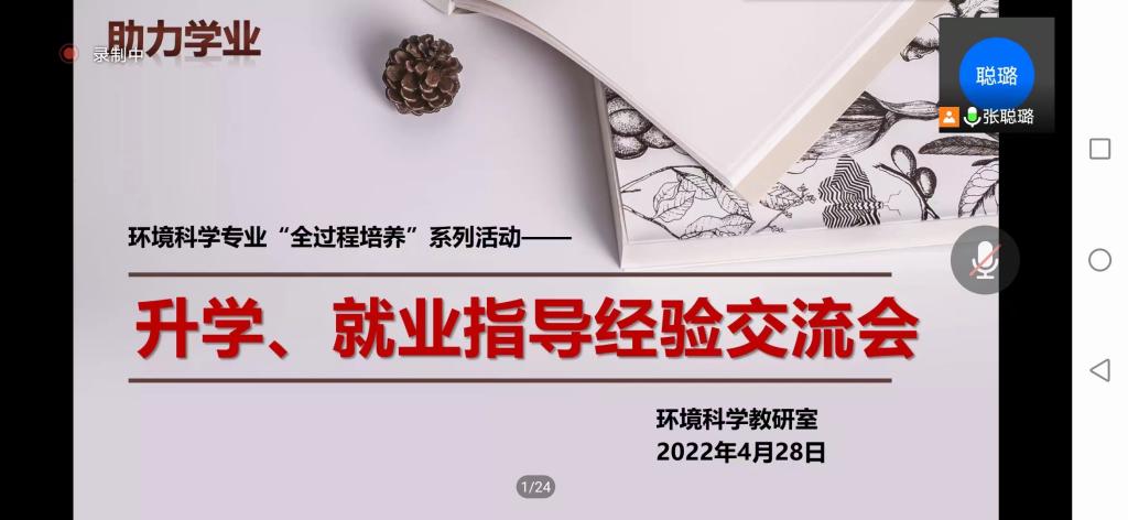 4月28日晚,Beat365中文官方网站环境科学教研室在线上举办了一年一度的环境科学专业升学、就业指导经验交流会。本次会议邀请了Beat365官网环境科学专业负责人、化学工程与技术学科主席侯晓虹教授做Beat365官网环境相关硕士专业介绍,同时邀请85期(2018级)7名保研、考研和就业的优秀学生代表做升学和就业的经验分享。环境科学专业大一至大三的学生、环境科学教研室全体教师共130余人参加了此次分享会。会议由环境科学教研室主任张聪璐主持。