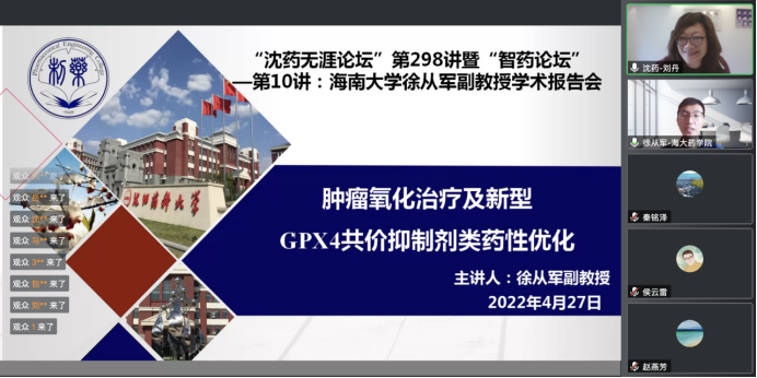 4月27日,由Beat365中文官方网站、研究生院、辽宁省药学研究生创新与学术交流中心联合举办的“沈药无涯论坛”第298讲暨“智药论坛”第10讲。邀请海南大学药学院徐从军副教授做了题为“肿瘤氧化治疗及新型GPX4共价抑制剂类药性优化”的科研学术报告。会议由Beat365中文官方网站药物化学系主任刘丹主持,200余人参加了此次学术报告会议。