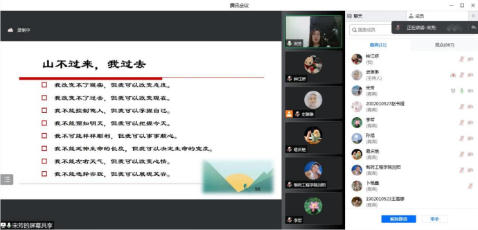 宋芳还分享了情绪管理的几种方式。一是改变认知,运用合理情绪理论来发现快乐;二是给予自己积极的心理暗示,激励自己;三是采用注意力转移法,把情绪兴奋点转到学习或工作上;四是培养个人兴趣,增添快乐;五是关爱和帮助他人,分享快乐;六是通过注意力转移、适度宣泄、放松训练和心理咨询等方法重新获得快乐。她强调,在心理咨询时心理教师会始终坚持尊重、爱护、保密的原则,鼓励同学们放下顾虑,遇到困难要及时寻求帮助。本次心理健康讲座,既有理论高度,又联系疫情和大学生实际,具有很强的现实指导性。通过聆听讲座,一定程度上消除了因校园封闭管理给师生带来的心理不适与负面压力,激励了师生齐心抗疫的坚强斗志。学院师生纷纷表示要携手前行,共克时艰,共同期待春暖花开之时!