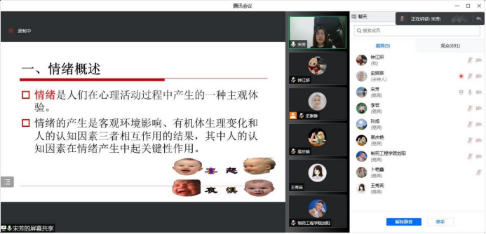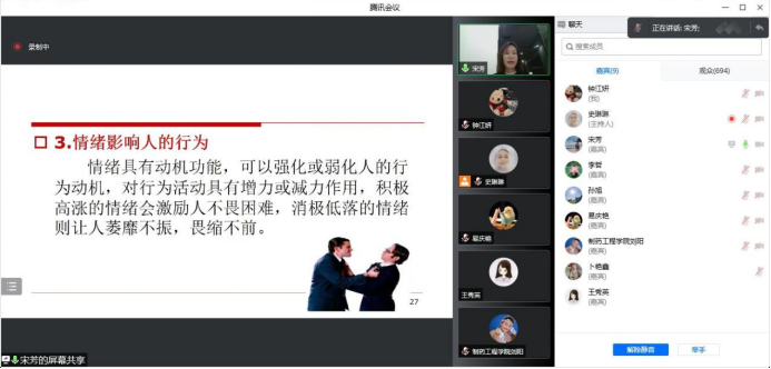讲座中,宋芳以“大学生心理健康”这个关键词为切入点,用大量生动鲜活的事例和全面详实的数据分析了大学生心理健康的现状,指出了心理健康的十个“经典标准”,列举了疫情下容易产生的心理问题,重点为我们讲解了情绪的影响因素和作用。她指出,情绪会影响生理健康、人的认知和人的行为,还会导致严重的情绪问题,比如抑郁、焦虑等。她引导学生不但要关注自身情绪,而且要学会在人际交往中运用合理的表达方式。