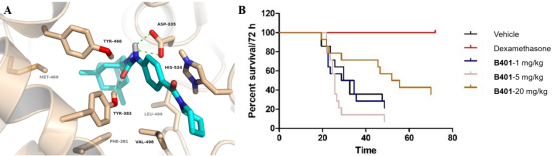 图1. (A)B401与sEH蛋白在活性腔中的模拟对接 (PDB code: 3WKE);(B) B401延长LPS诱导的脓毒症小鼠的生存曲线。
