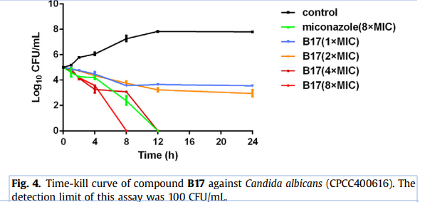 羊毛甾醇14α-去甲基化酶(CYP51)是真菌细胞膜麦角甾醇生物合成的关键酶,为治疗真菌感染的重要靶点。课题组运用生物电子等排原理,以硒原子替换氧原子,得到一系列咪康唑含硒类似物。该类化合物表现出良好的抗耐药真菌活性,其中,化合物A03 对真菌CYP51 具有较高的抑制作用,能防止真菌生物膜的形成,且安全性高于咪康唑。对A03进一步结构优化发现了化合物B17,具有更强的抗真菌活性、抗耐药真菌活性、杀菌活性和抗生物被膜活性,且代谢率、细胞毒性和溶血作用均低于A03。时间-杀菌曲线表明,化合物B17 在2 μg/mL 时可以完全杀死白色念珠菌细胞。小鼠体内活性实验证明,化合物B17 腹腔注射给药(0.4 mg/kg 和0.6 mg/kg)可明显降低系统性白色念珠菌感染小鼠的肾脏载菌量,具有良好的体内抗真菌活性。课题组创新地将硒元素引入到抗真菌小分子中,为新型抗真菌药物的发现提供了新的思路。