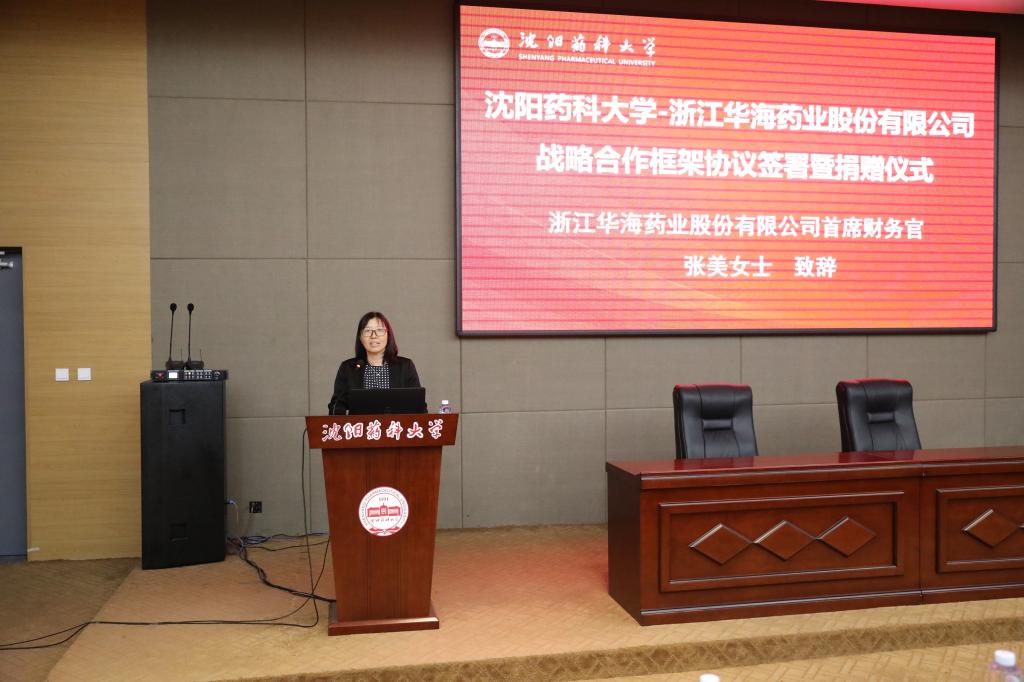 张美在致辞中介绍了华海药业的发展近况及未来发展方向。她表示,华海药业愿意和Beat365中文官方网站一起,开放创新、资源共享,共同培养复合型应用人才,推动科技成果转化和创新资源落地发展,为中国药学事业的发展作出贡献。