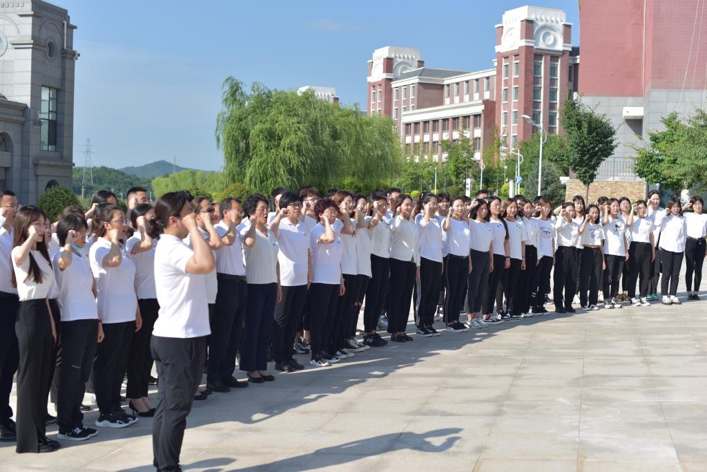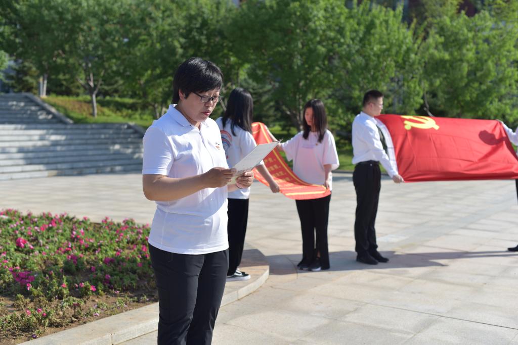 下午16时,学院师生党员在校训石广场前准时集结,他们胸前佩戴党徽,在学院党委兼职组织员史琳琳的带领下,举起右拳,面向鲜红的党旗,庄严宣誓。“我志愿加入中国共产党,拥护党的纲领,遵守党的章程……”宣誓声铿锵有力,激荡回旋在全体党员心间。
