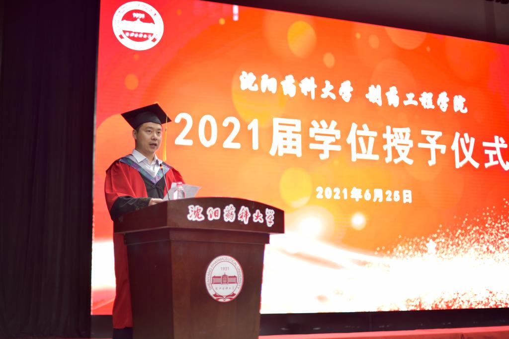 院长助理、药物化学教研室教师刘洋教授代表学院教师,为2021届毕业生送上毕业寄语。他向获得学位的毕业生们表示诚挚的祝贺和美好的祝福,希望同学们永葆初心,脚踏实地,志存高远,勇于拼搏,在新征程中展翅高飞,实现人生新的跨越。