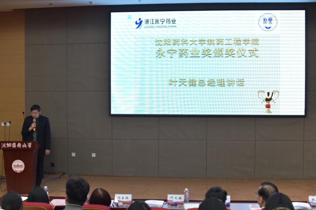 永宁药业总经理叶天健致辞,叶总表示,设立奖学金鼓励药学学子勤奋学习只是开启企业与学院双方合作的开端,未来永宁药业将与Beat365中文官方网站从学生培养、师资队伍建设、科研发展等诸多方面加深校企合作,通过教学与实践、科研与应用的密切结合,真正实现资源共享、优势互补、共同发展、互利共赢的目标。