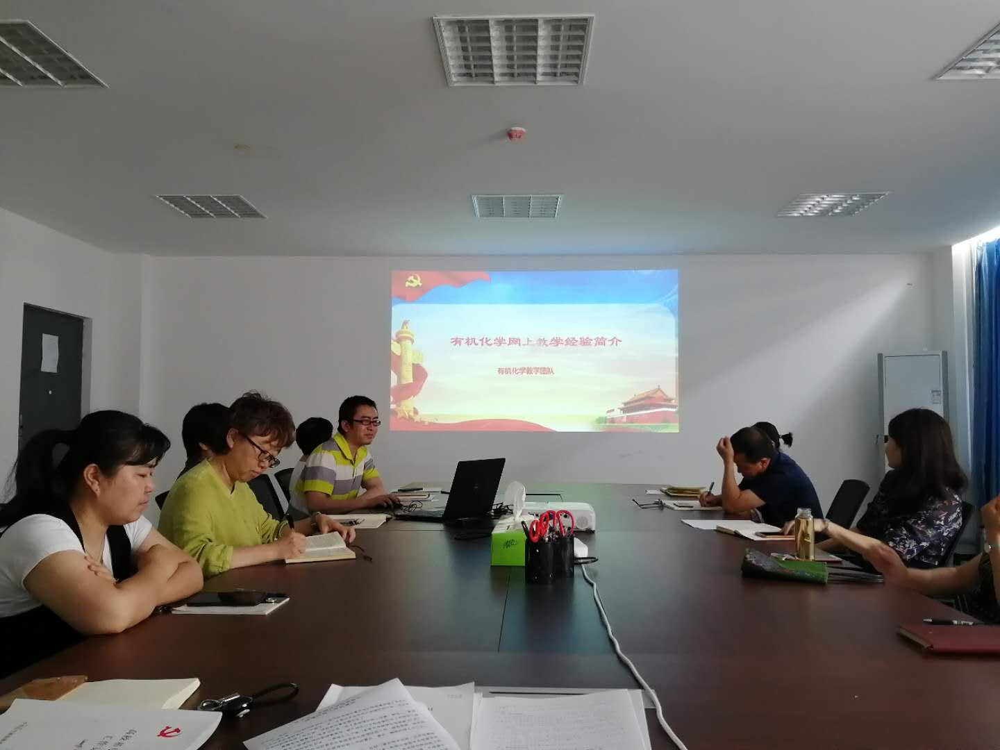 首先,无机化学党支部党员教师张莹以欧洲归国心路历程为题,以分享战“疫”日记的形式,分享了其从2020年1月17日身在荷兰至4月8日顺利归国隔离结束的经历、心得以及感悟。随后,有机化学教研室党员教师赵明明代表有机化学教研室,从线上教学的准备、课程的进行、过程性评价、期末考试等方面介绍了教研室理论课线上教学经验;从线上教学的准备、课程的进行、虚拟仿真实验等方面介绍了教研室实验课线上教学经验。最后,全体参会人员通过“学习强国”平台共同观看了由中央党校(国家行政学院)公共管理教研部副教授张克主讲的视频党课。