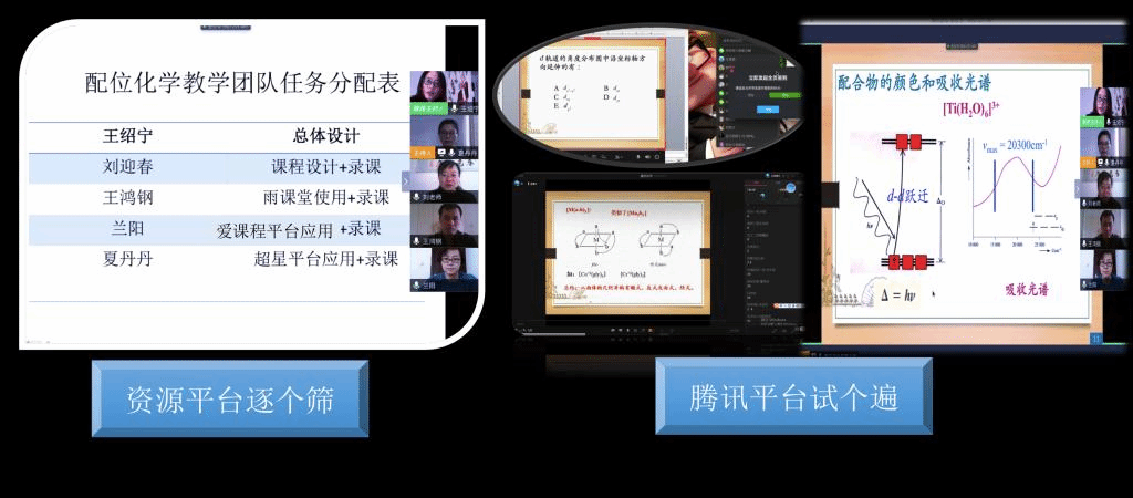 《配位化学》教学团队采用协作分解教学任务,共同完成前期超星平台建课。为推出高质量在线课程,团队教师夜以继日地忙碌着,丰富课堂内容、精修课件、EV录屏课程。录课不同于以往讲课,教师需要写讲稿、练讲稿、录制、后期剪辑,任务量很大。而后期在平台上传视频、设置任务点、建设题库等工作也异常繁琐都需要一项一项地落实。为确保按时、高质完成各项任务,教学团队制定出工作进度表,在课程建设中,任务落实到人、分解到点,各负其责、优势互补、资源共享,使课程建设任务得以快速完成。